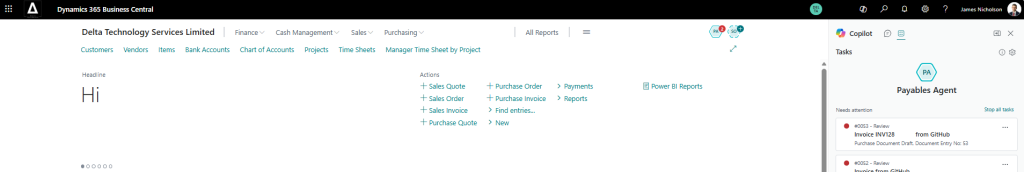 Payables Agent is accessible from within Business Central and sits in your Agent quick access menu alongside other Microsoft agents such as the Sales Order Agent and your own custom agents.